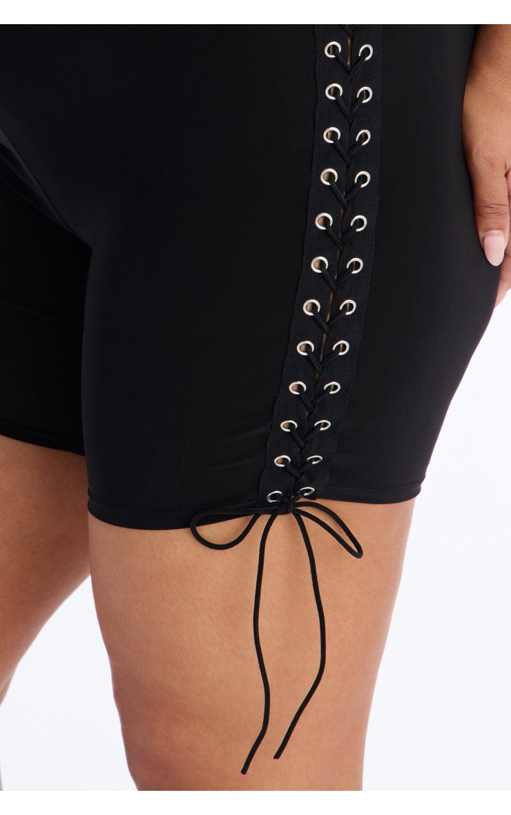 Додайте пікантності до свого образу з цими шортами-байкерами "Зав'язані". Ефектна шнурівка на боці надає їм зухвалого вигляду, а облягаючий крій підкреслює фігуру. Класичний чорний колір забезпечує універсальність.