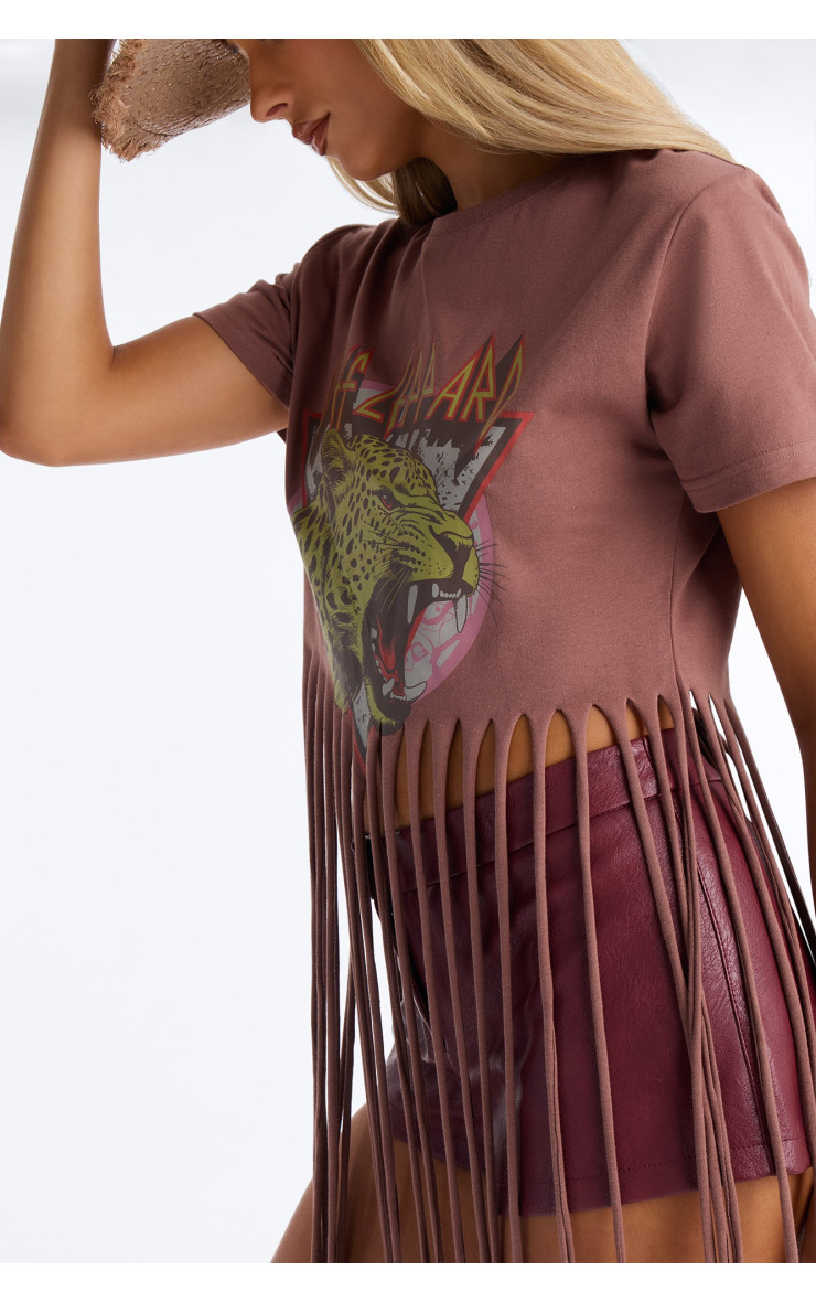 Яскравий топ "Def Leppard" з ефектною бахромою. Ця модель додасть вашому образу рок-н-рольного духу та невимушеної чарівності.