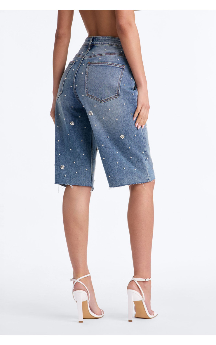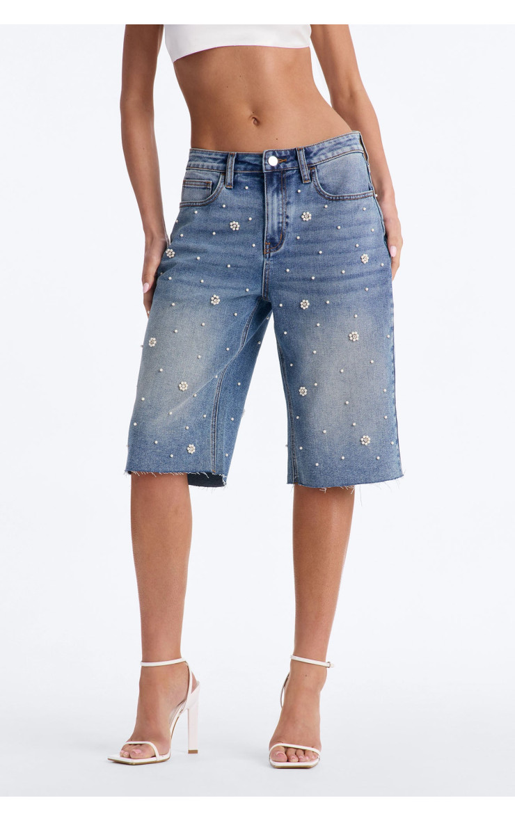 Додайте нотку розкоші до свого образу з цими неймовірними денімними бермудами "О, такі перламутрові". Делікатна вишивка та перламутрові деталі виглядають надзвичайно елегантно, а вінтажний відтінок деніму надає їм особливого шарму. Чудовий вибір для особливих випадків.