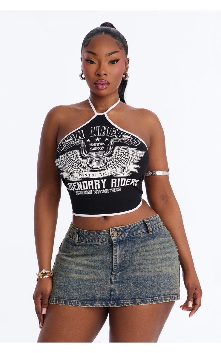 Відчуйте себе справжньою рок-зіркою з цим укороченим топом "Iron Wheels". Прикрашений ефектними шипами та графічним принтом, він додасть вашому образу зухвалості. Виготовлений з м'якої, еластичної тканини, цей топ чудово сидить по фігурі. Додайте драйву до свого стилю!