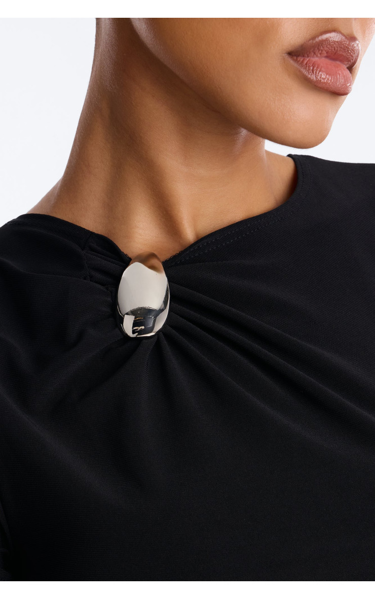 Стильний топ з асиметричним вирізом та коротким рукавом, доповнений елегантним металевим акцентом. Цей топ стане яскравим елементом вашого гардеробу, надаючи йому сучасного вигляду.