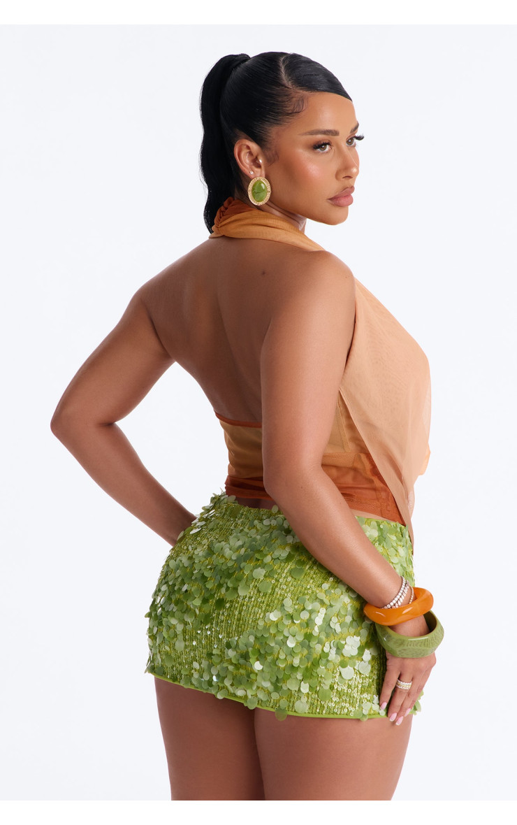 Ефектний топ "Desert Baddie" з напівпрозорої сітки, що має комір-стійку та вишуканий крій халтер. Ця модель додасть вашому образу зухвалості та сучасності.