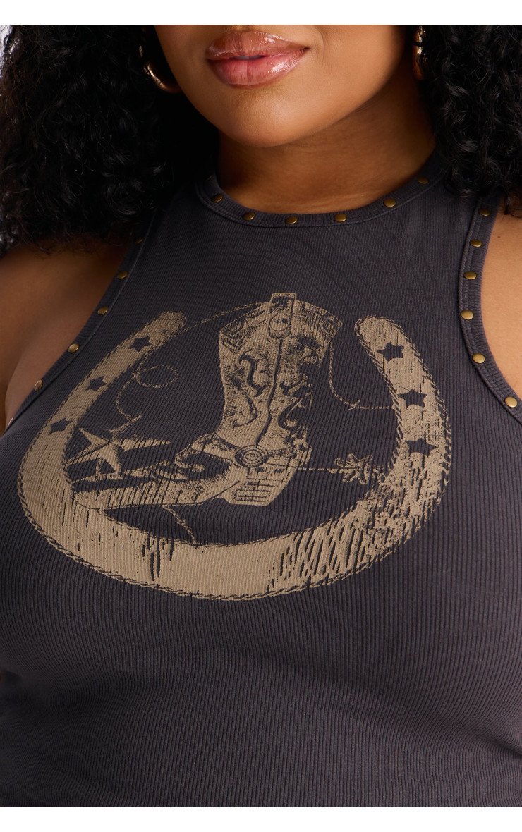 Відчуйте дух Дикого Заходу з цим стильним топом "Cowgirl Boots". Прикрашений шипами та виконаний з різьбленим візерунком, він додасть вашому образу автентичності. Виготовлений з м'якої, еластичної тканини, цей топ забезпечує чудову посадку. Додайте нотку ковбойського шарму до свого стилю!