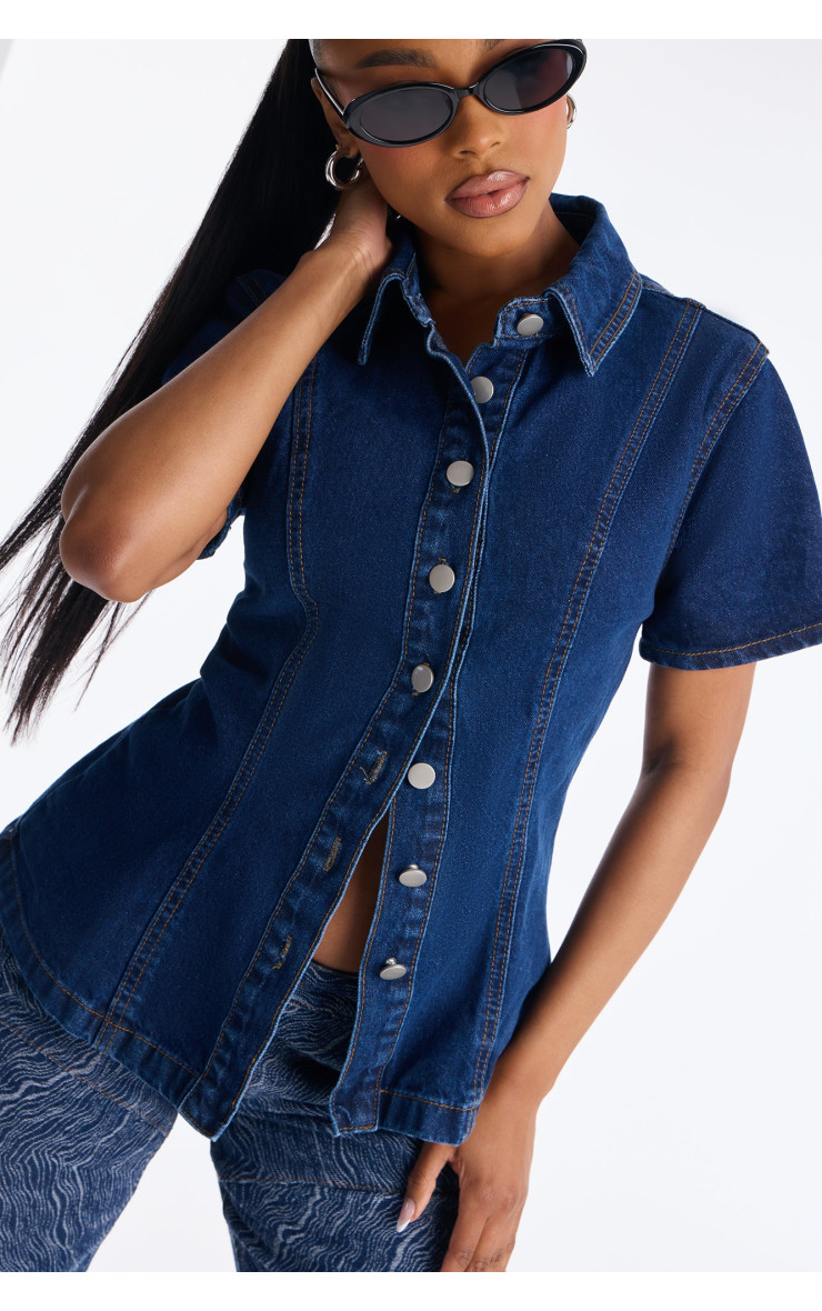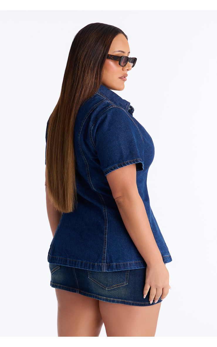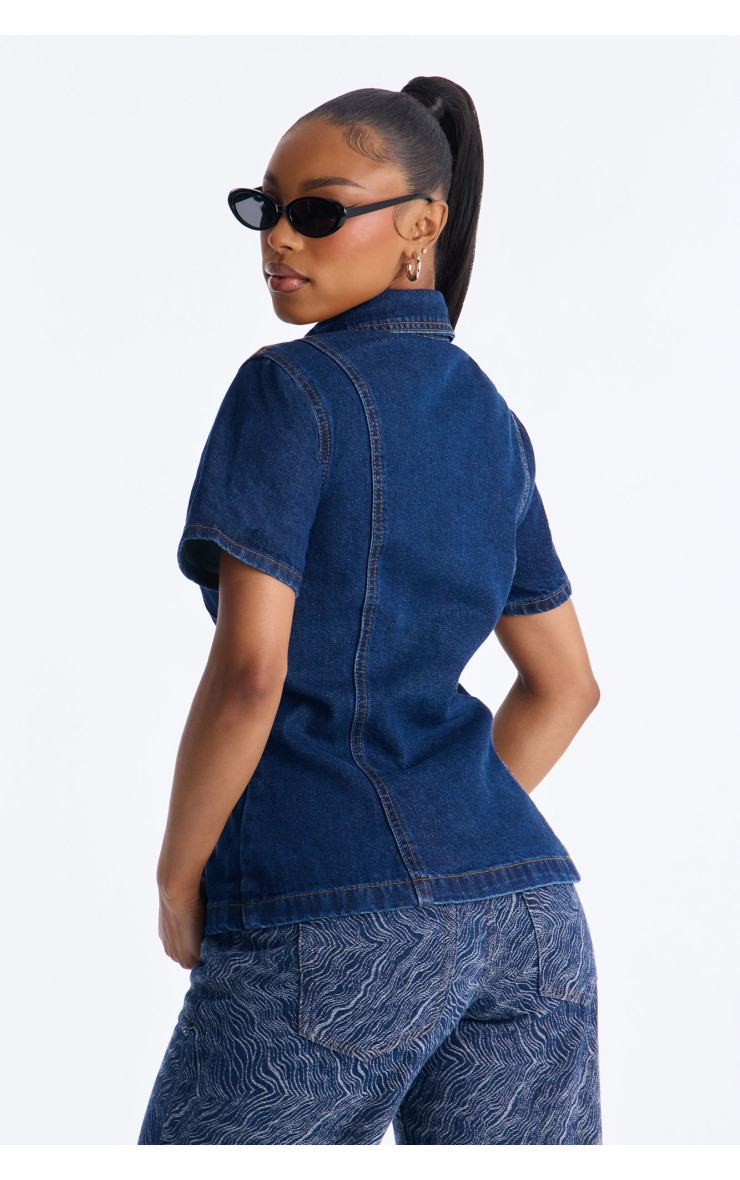 Денім сорочка "Nina" із затяжкою на талії - Індиго